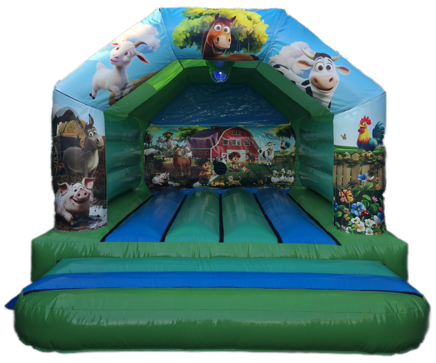 A farm themed disco bouncy castle on a green and blue base, featuring built-in Bluetooth speakers and LED disco lighting. The 15ft x 12ft size provides plenty of room for active play.