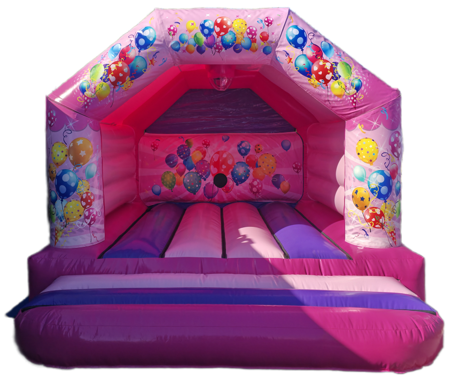 A pink balloon party themed disco bouncy castle on a pink, purple and fuchsia base, featuring built-in Bluetooth speakers and LED disco lighting. The 15ft x 12ft size suits most gardens and community halls.