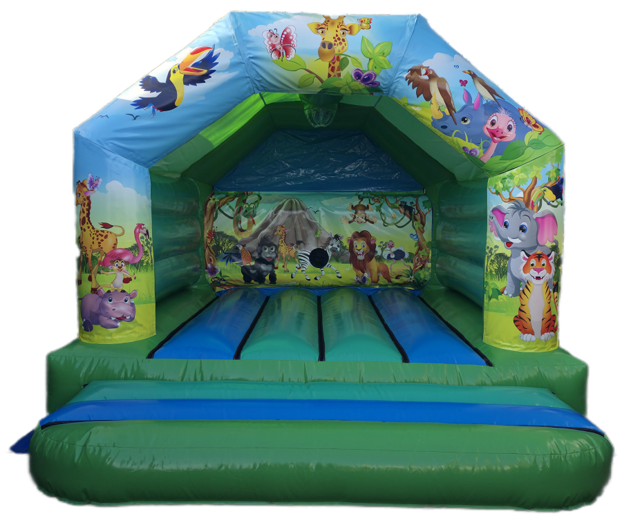 A safari themed disco bouncy castle on a green and blue base, with built-in Bluetooth speakers and LED disco lighting. The 15ft x 12ft size suits most gardens and community halls.