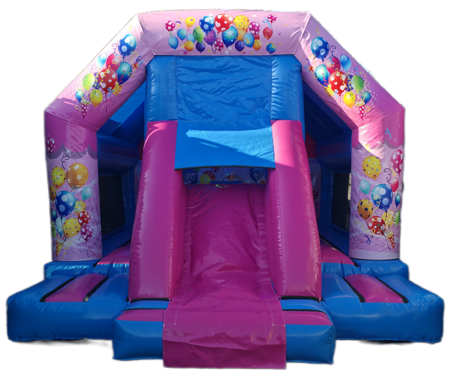 A pink balloon party themed disco slide combi bouncy castle on a pink and blue base, with built-in Bluetooth speakers and LED disco lighting. The 18ft x 13ft size combines a spacious bouncing area with a front slide for added variety.