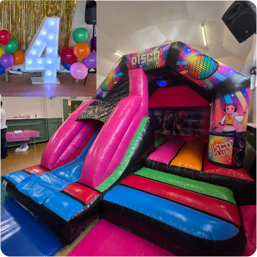 You select your preferred bounce and slide castle and LED number from the available range when booking. Options include disco ready slide combis, themed slide combis and standard designs.