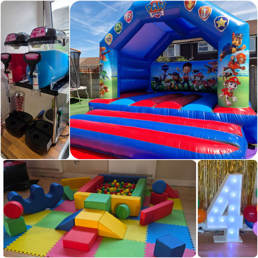 You choose your preferred bouncy castle, soft play theme, LED number and sweet treat machine from the available range at booking.